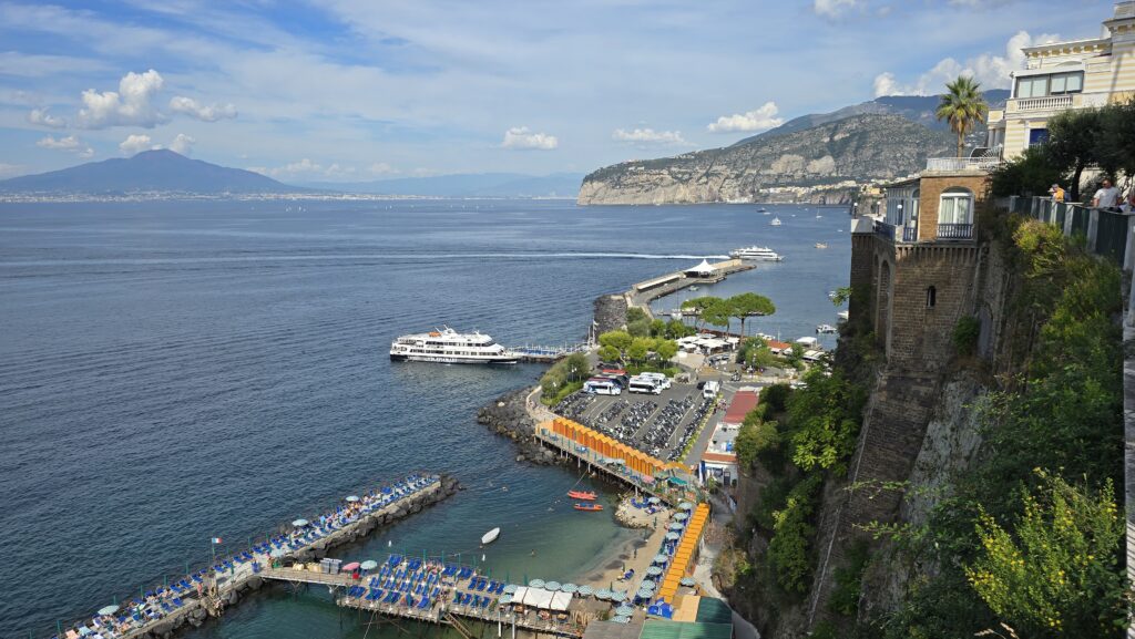 Daarna reden we verder langs de Amalfikust. De zon glinsterde in het blauwe water van de Tyrreense Zee. De kustlijn werd omringd door bergen, dorpjes en kronkelwegen die telkens weer een nieuw uitzicht boden. Uiteindelijk kwamen we in Sorrento, gelegen op het schiereiland Sorrentina. De stad had een gezellige uitstraling met kleurrijke winkelstraten vol keramiek, kant en houtsnijwerk. Van bovenaf keek je uit over de zee, vol boten, met daarachter de bergen. Door smalle straatjes en trappen daalde je af naar beneden, waar je uitkwam bij het strand en de restaurants langs het water. Het geheel ademde sfeer en rust.