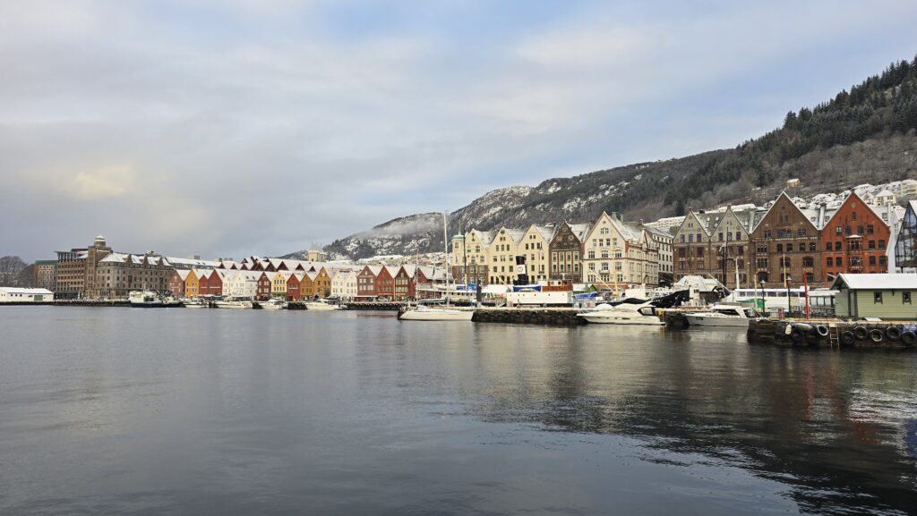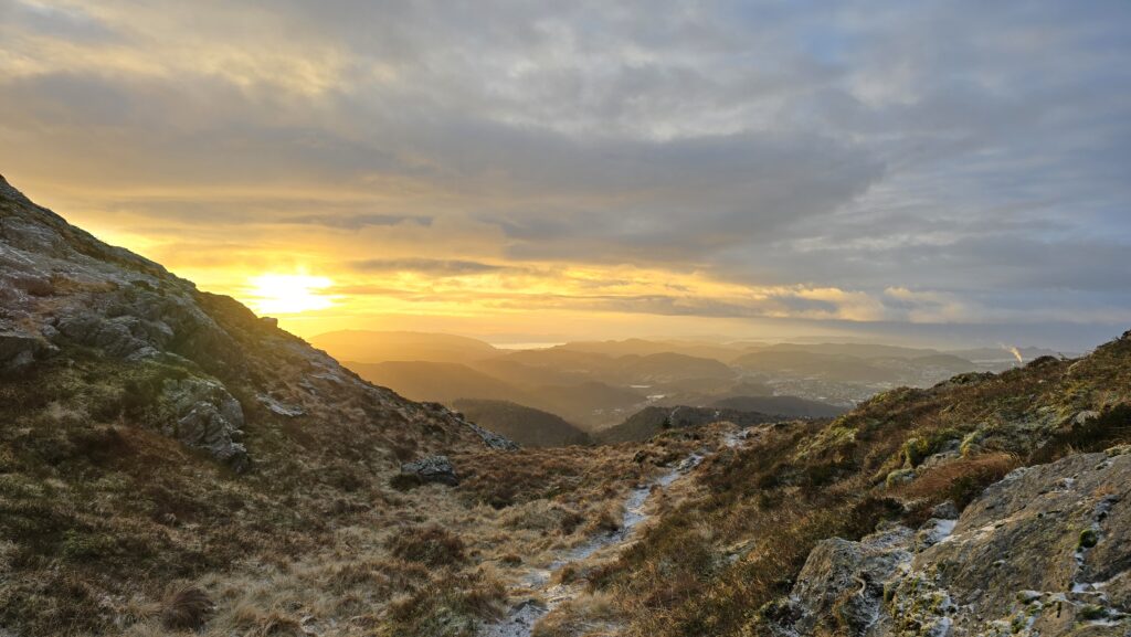 Een dag later vloog ik vroeg naar Bergen. De avond ervoor had ik mijn taxi al besteld en mijn spullen klaargezet, zodat ik meteen kon vertrekken. In de taxi vroeg de chauffeur of ik Ulriken ging beklimmen, de hoogste van de zeven bergen rondom Bergen. Ik moest eerlijk toegeven dat ik er nog niet van had gehoord. Bij de gate zocht ik het op. Foto’s, uitzicht, kabelbaan. Ik besloot het te doen. De vlucht duurde nog geen drie kwartier. Rond zeven uur stond ik op het vliegveld van Bergen. De kabelbaan ging pas om tien uur. De stad was nog donker, dus besloot ik naar boven te lopen.