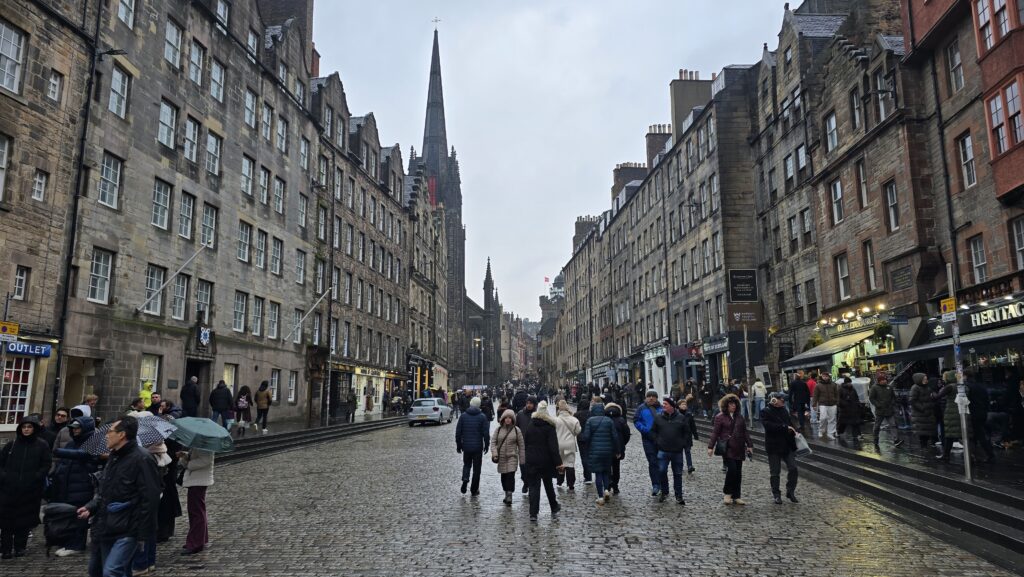 Eenmaal aangekomen merkte ik direct weer dat ik in Schotland was. De vriendelijkheid en beleefdheid van de mensen vallen me daar altijd op. Een deur die wordt opengehouden, een begroeting van een onbekende, een praatje dat nergens over hoeft te gaan. We dumpten onze spullen in het hostel en liepen de stad in. Uiteraard begonnen we met een drankje, haggis als voorgerecht en een goed hoofdgerecht erachteraan. We liepen langs de bekende plekken, maakten grappen waar we zelf soms harder om lachten dan nodig was en namen bewust een ontspannen tempo aan. De avond mocht immers nog lang worden. Na een kort rustmoment in het hostel gingen we opnieuw de stad in om te eten. In onze zoektocht naar een restaurant bleven we – heel toevallig natuurlijk – regelmatig “even hangen” in een pub. Puur om de sfeer te testen. Uiteindelijk vonden we een plek met kleine hapjes die we konden delen. Daarna doken we een live music bar in waar ik twee jaar eerder ook was geweest. De muren hingen vol met vlaggen, oude platenhoezen, bierbordjes en vergeelde foto’s. Een band speelde bekende nummers, mensen zongen luid mee, glazen tikten tegen elkaar en voor het kleine podium werd gedanst alsof niemand morgen hoefde te werken. De sfeer was warm, ongedwongen en licht chaotisch – precies goed. We bezochten nog een paar pubs en rond één uur bleek vrijwel alles dicht. Dat was prima. Voldaan liepen we terug naar het hostel. Morgen wachtte Arthur’s Seat.