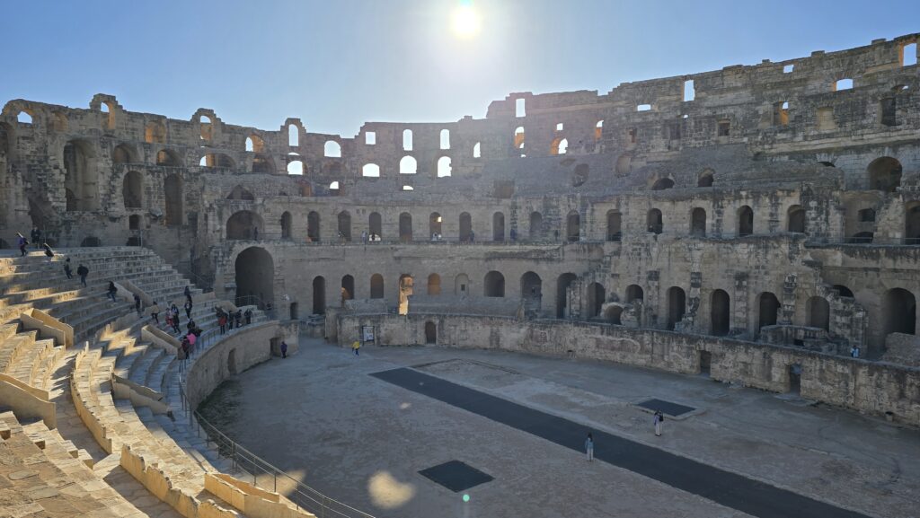 Om vijf uur ’s ochtends vertrokken we met een kleine groep en een gids voor een tweedaagse tocht richting de Sahara. De komende dagen zouden we verschillende bezienswaardigheden doorkruisen met als eindbestemming de woestijn, waar we zouden overnachten. Onderweg bezochten we het amfitheater van El Djem, een kolossaal bouwwerk dat qua omvang en vorm sterk doet denken aan het Colosseum in Rome. Terwijl we in de arena stonden, vertelde de gids over de gevechten en het publiek dat hier ooit samenkwam. Het idee dat hier eeuwen geleden duizenden mensen juichten of zwegen, maakt geschiedenis tastbaar. Later bezochten we een Berbergezin en zagen we hoe hun woningen deels ondergronds zijn gebouwd. Door hun huizen in de aarde uit te hollen, houden ze de hitte van de zomer buiten en blijft het in de winter juist warmer. Het is een manier van leven die is afgestemd op de omgeving, niet ertegenin.