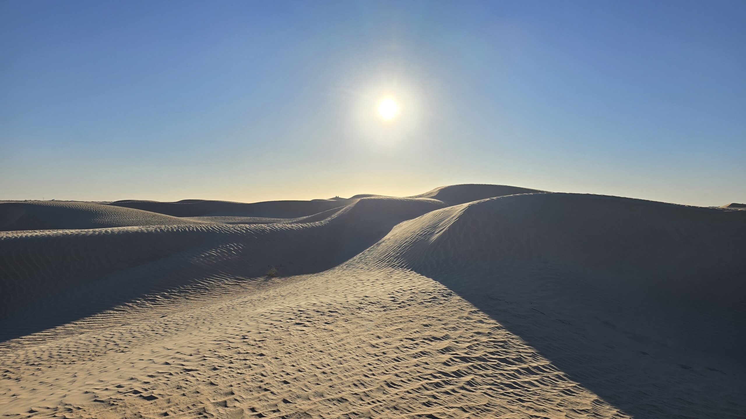Tussen de stops door reden we urenlang. Het landschap veranderde langzaam maar merkbaar. Groene stukken maakten plaats voor drogere vlaktes, de bebouwing werd schaarser, de horizon wijder. Na ons bezoek aan de Berbers volgde nog een rit van ongeveer drie uur. Er werd minder gesproken in de bus; de uitgestrektheid werkte bijna verstillend. En toen, zonder aankondiging, verschenen de eerste duinen. Niet één of twee, maar golven van zand die zich uitstrekten tot waar het oog reikte.