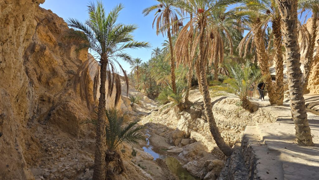 De volgende ochtend stonden we opnieuw vroeg op. Na een korte nacht keek ik nog één keer naar de hemel voordat deze verbleekte in het ochtendlicht. We ontbeten en vertrokken weer richting Tunis. Onderweg reden we langs Chott el Jerid, een uitgestrekte zoutvlakte die oogt als een witte, opgedroogde zee. Later bezochten we een oase vol palmbomen, bekend als filmlocatie voor onder andere Star Wars. We liepen met de gids een berg op en daalden via een smalle trap af naar een vallei waar water tussen de rotsen stroomde en palmbomen schaduw boden. Het contrast met de droge woestijn was groot; waar eerst alleen zand was, klonk nu het zachte geluid van stromend water.