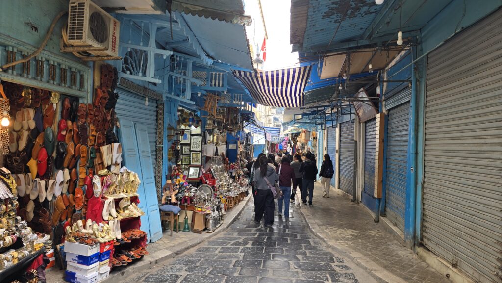 Afrika is een continent waar ik altijd even aan moet wennen. Dat begint zodra je het vliegveld verlaat. Taxichauffeurs die je aanspreken en bedragen noemen waarvan je weet dat ze te hoog zijn, maar waar je toch in meegaat omdat je de situatie nog niet goed kunt inschatten. Auto’s die niet netjes binnen één rijstrook blijven, bestuurders die met hun telefoon in de hand rijden, mensen die zonder aarzelen de weg oversteken. Het verkeer lijkt chaotisch, maar beweegt zich toch voort. De energie is anders dan in Europa, minder gereguleerd, minder voorspelbaar. Mijn verblijf was in Tunis, de levendige hoofdstad van Tunesië, waar oude geschiedenis en hedendaagse drukte elkaar voortdurend raken. In de medina lopen smalle steegjes kriskras door elkaar, langs marktkramen, verweerde muren en houten deuren in diepe blauwen en groenen. Geuren van kruiden en vers brood vermengen zich met het geroezemoes van handelaren en voorbijgangers.